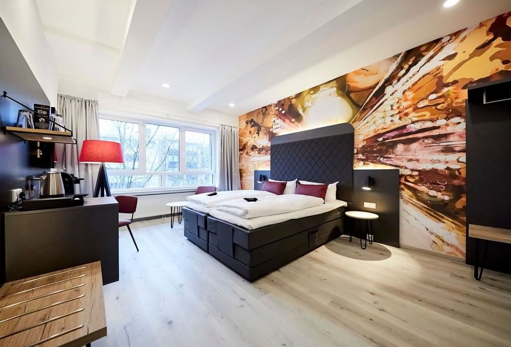 Welcome to your personal oasis of relaxation at SMARTY Hotel Euler. Experience bright, modern guest rooms designed for two persons, featuring a comfortable king-size boxspring bed. This haven of peace and tranquility is situated in a quiet, rear-facing location. The exclusive SMARTY Relax chair pampers you with soothing massage functions – perfect for unwinding after a busy day. The SMARTY Deep Sleep Kit, combined with aromatherapy using an ultrasonic diffuser and essential oils, creates the ideal atmosphere to relax and recharge.